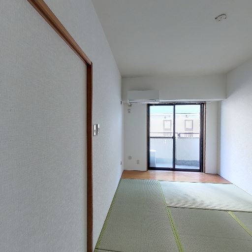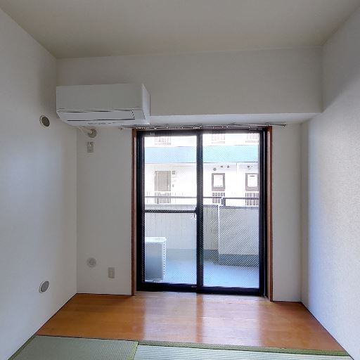 • 和室でバルコニーに面した窓(確度90%):畳敷きの部屋で、正面に掃き出し窓とバルコニーが見える。エアコンも設置済み。