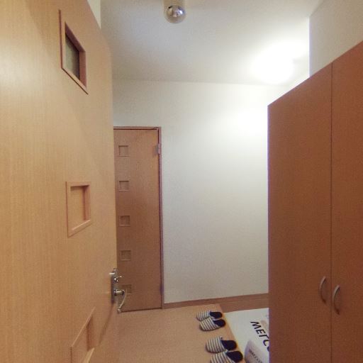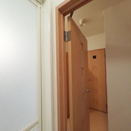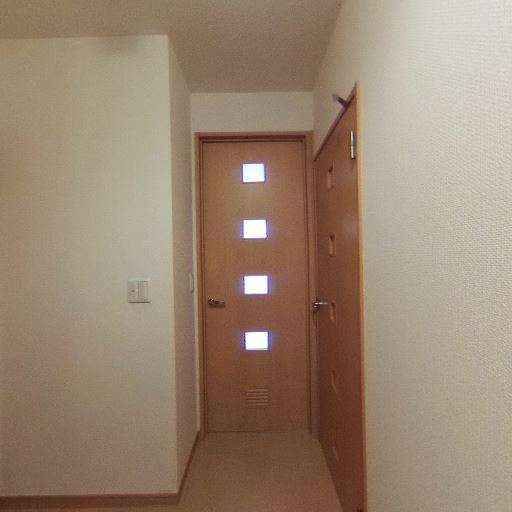 玄関から室内への動線(確度78%):玄関土間からまっすぐ室内ドアへ続く直線的な廊下。左手にスイッチ、右手に収納扉らしき建具がある。
