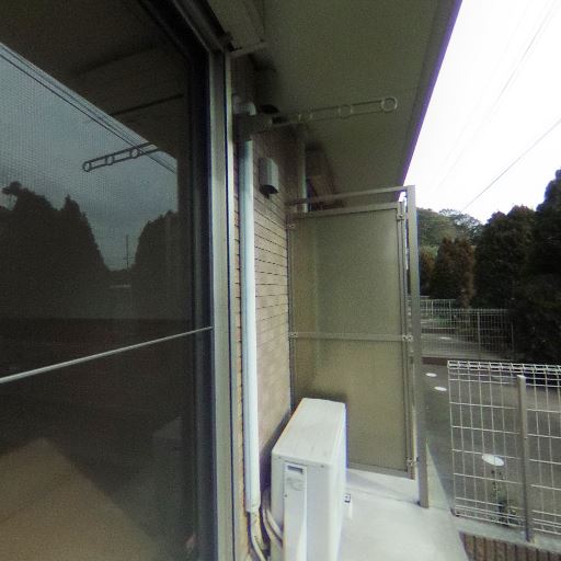室外機とコンセント位置(確度64%):エアコン室外機がテラス端に設置されており、動線の邪魔にはなりにくいが作業スペースは限られる。