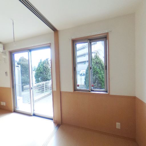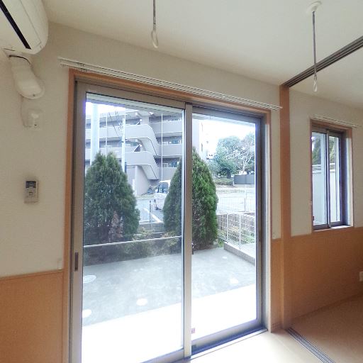 採光は十分そうだが方位不明(確度67%):室内側の掃き出し窓が大きく、外部に遮るものが少ないため明るさは確保されそう。ただし天候が曇天で方位は判断できない。