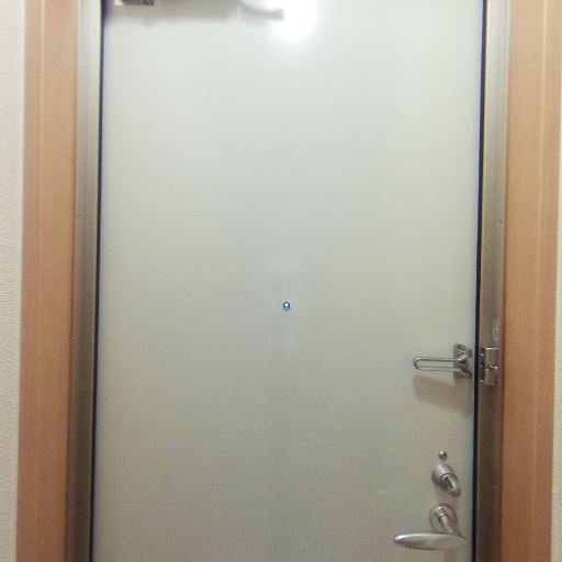 玄関扉とセキュリティ(確度86%):金属製の玄関ドアにドアスコープ・内側サムターン・補助ロックが確認できる。