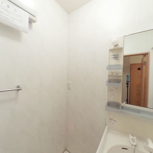 洗面台と鏡収納あり(確度90%):洗面ボウル一体型の洗面台と鏡面収納が確認できる。小物棚・コンセントも付属。