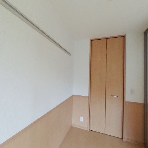 収納扉付きクローゼット(確度74%):木目の観音開きの収納扉が見え、基本的な収納は確保されている。