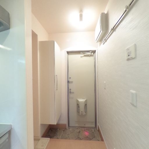 玄関と収納の配置(確度86%):玄関扉の横にトール型の下足収納があり、床は土間タイルで区切られている。