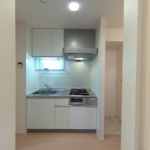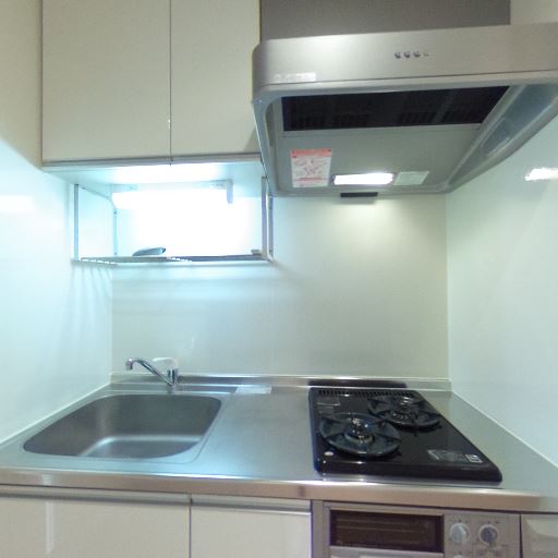 キッチンの充実度(確度86%):2口ガスコンロ、レンジフード、上下収納、ステンレスシンクが見える。作業スペースはややコンパクト。