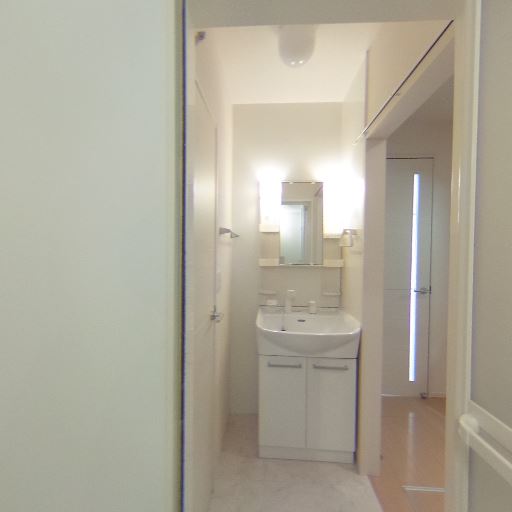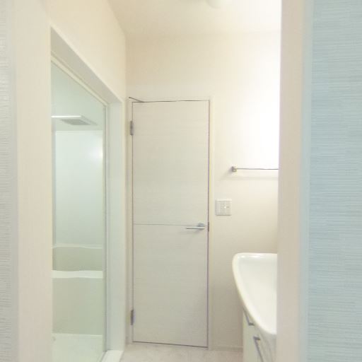 脱衣所への動線(確度69%):引き戸の先に洗面台と廊下が続く配置。浴室−洗面−廊下の動線が直線的。