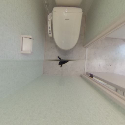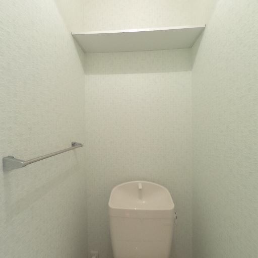 トイレ個室の設備(確度90%):温水洗浄便座付きのトイレ本体が設置され、壁にはペーパーホルダーとタオル掛けがある。背面上部に収納棚も確認できる。