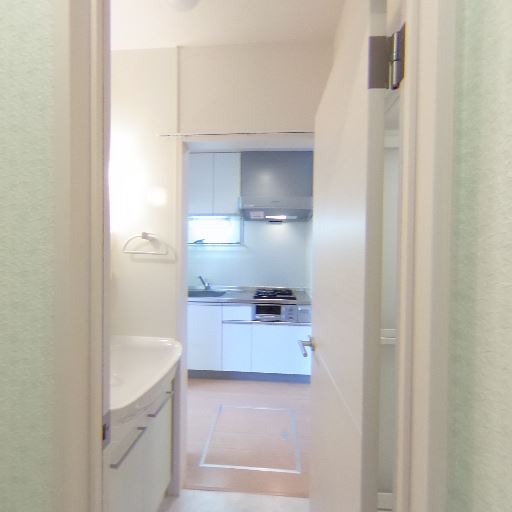 水回りが近接したレイアウト(確度80%):キッチン横に洗面・浴室が隣接しており、室内ドアや浴室扉が近い。