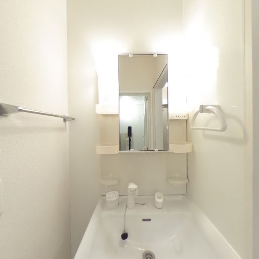 タオル掛け・小物フックの充実(確度78%):洗面所周辺にタオルバーとハンドタオル用リングが設置されている。