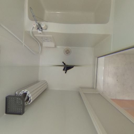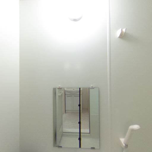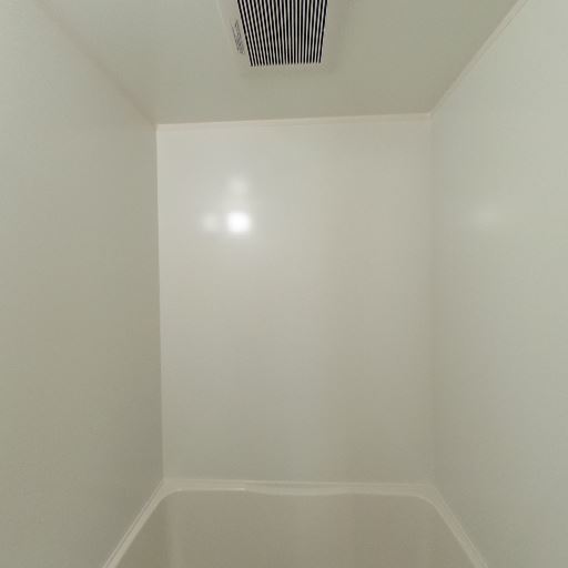 浴室が明るく清潔(確度83%):浴室は白基調で照明が明るく、シャワーとミラー、浴槽・風呂フタが見える。