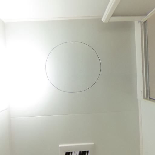 換気設備あり(確度70%):天井に換気扇グリルが見える。湿気対策ができる。