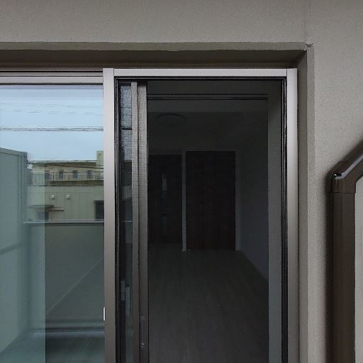 バルコニーと掃き出し窓(確度86%):大きな掃き出し窓の先にバルコニーが見える。
