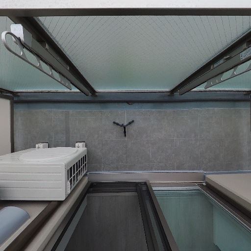 バルコニーの奥行きと設備(確度86%):細長いバルコニーで、両側に目隠しパネルとガラス手すり。物干し金物が2本、室外機設置済み。