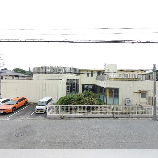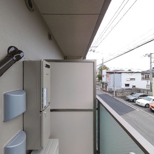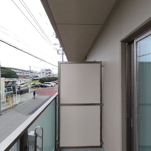 道路向きのバルコニー(確度79%):道路と駐車場に面したバルコニーで、前面は建物・駐車スペースの景色。視界は開けているが車や人通りがある。