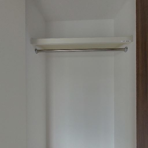 クローゼットのハンガーパイプ付き収納(確度80%):壁面に枕棚とハンガーパイプが備わったオープンタイプの収納がある。