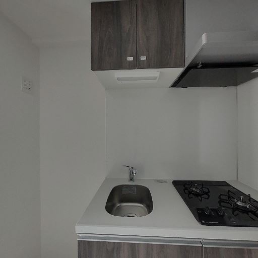 コンパクトなキッチン(確度86%):2口ガスコンロと小さめのシンク、上部吊り戸棚・下部収納が確認できる。単身向けサイズ。
