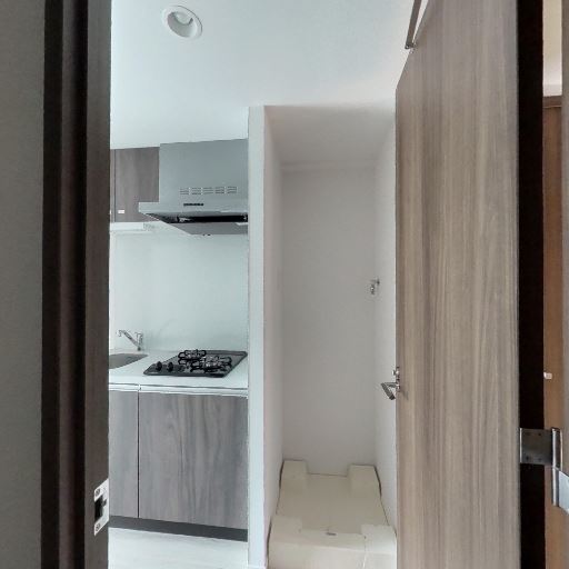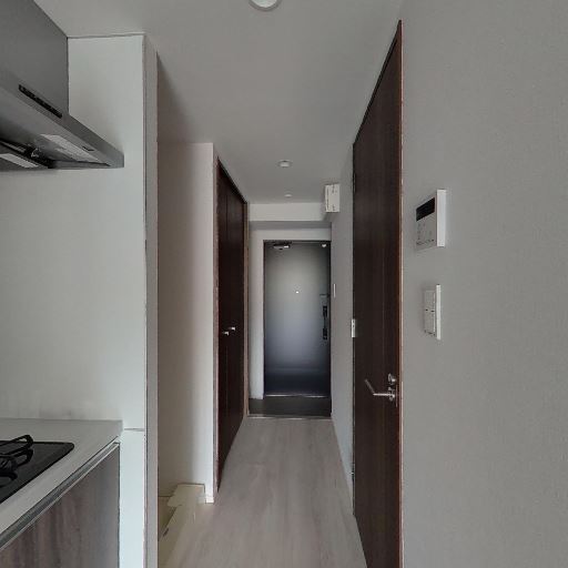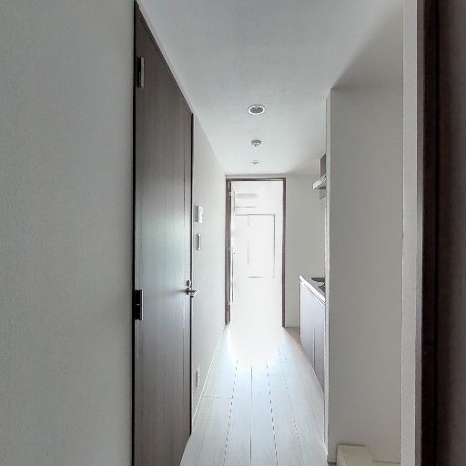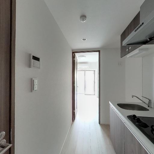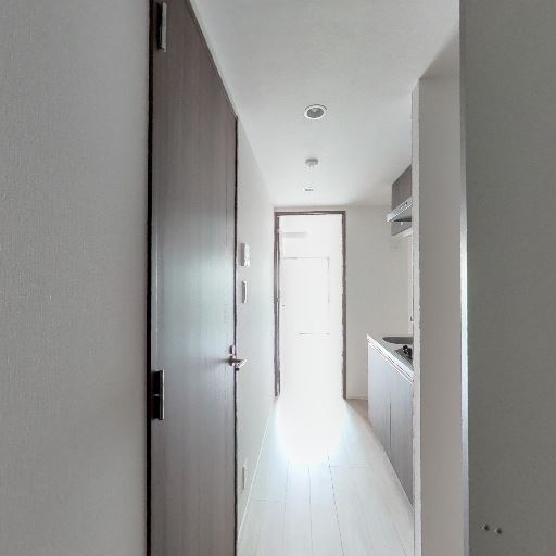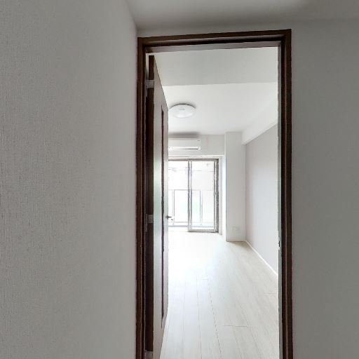 廊下の奥に居室が続く1K/ワンルーム動線(確度82%):キッチン脇の廊下の先にドアがあり、その先に居室とバルコニーが見える。