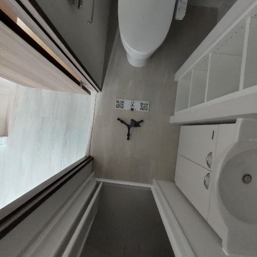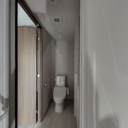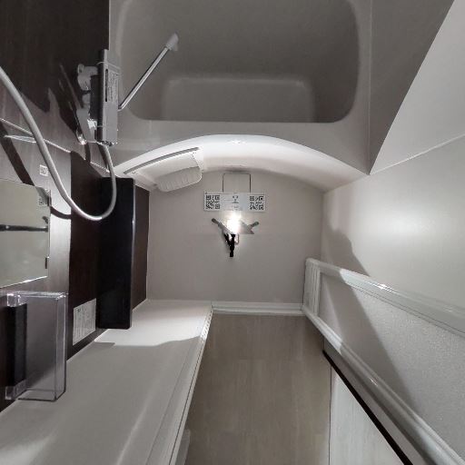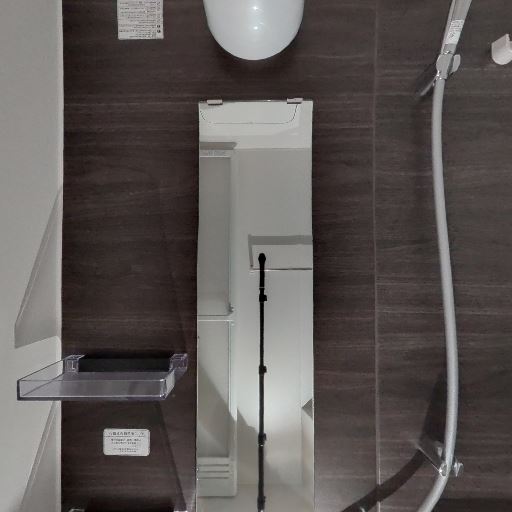 ユニットバスとトイレが隣接した水回り動線(確度86%):浴室(浴槽・シャワー・鏡・棚)とトイレが同じゾーンにあり、出入口も近い。日常の動線が短くなる配置。