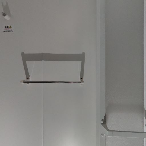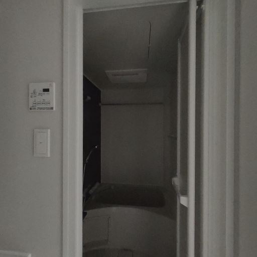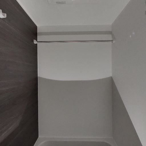 浴室乾燥・換気設備あり(確度90%):天井に換気口とガラリ、物干しポールが確認できる。洗濯物の室内乾燥やカビ対策に有効。
