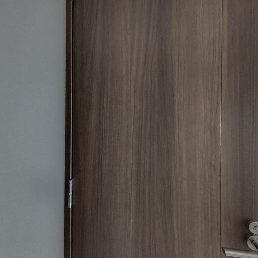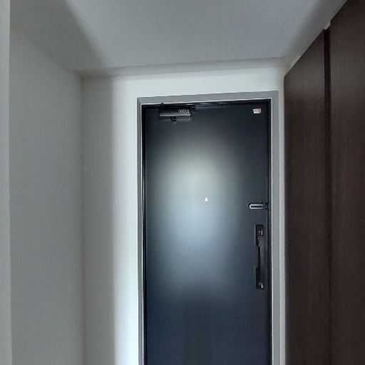 玄関ドアと防犯性(確度79%):金属製の玄関ドアでドアスコープと内側チェーン(またはドアガード)が確認できる。