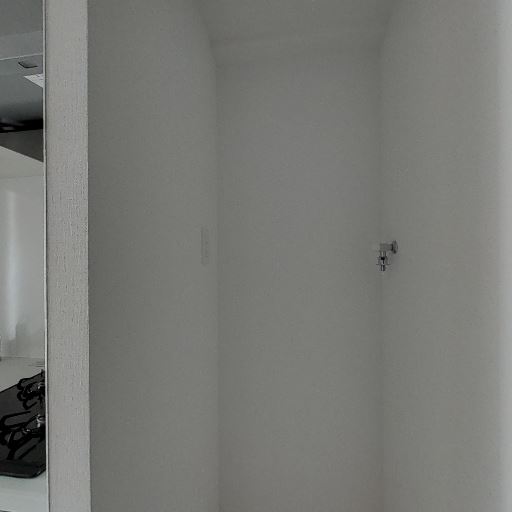 洗濯機置き場の位置(確度78%):床面に給水・排水口と操作パネルがあり、廊下沿いの収納扉内に洗濯機置き場があると推測。