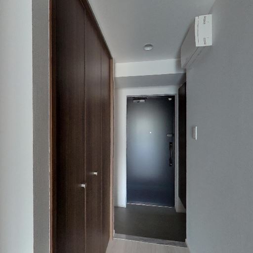 玄関まわりの収納充実(確度78%):玄関側に背の高いクローゼット(もしくはシューズボックス)の扉が並ぶ。