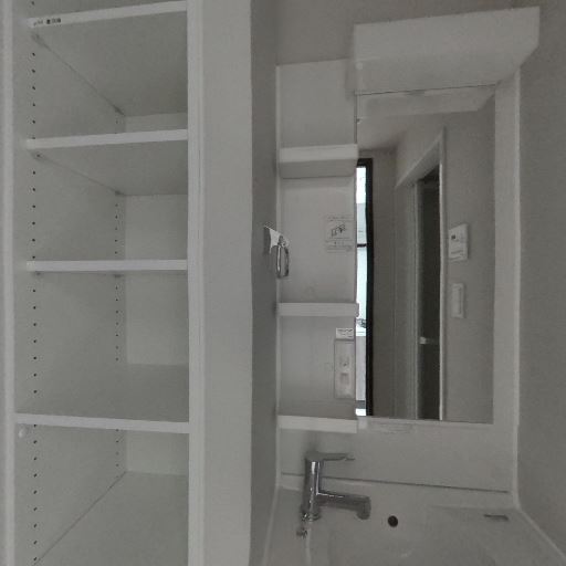 収納と可動棚が充実(確度86%):洗面横に複数段の可動棚があり、タオルや日用品を整理しやすい。