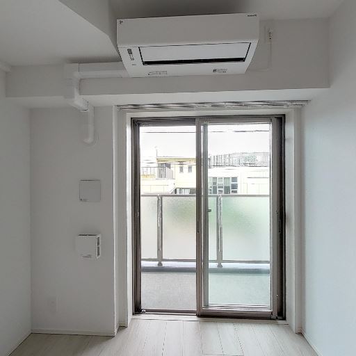 天井ビルトイン型エアコン(確度86%):窓上部の天井面にビルトインタイプのエアコンが設置されている。室内機が露出しにくく、見た目がすっきり。