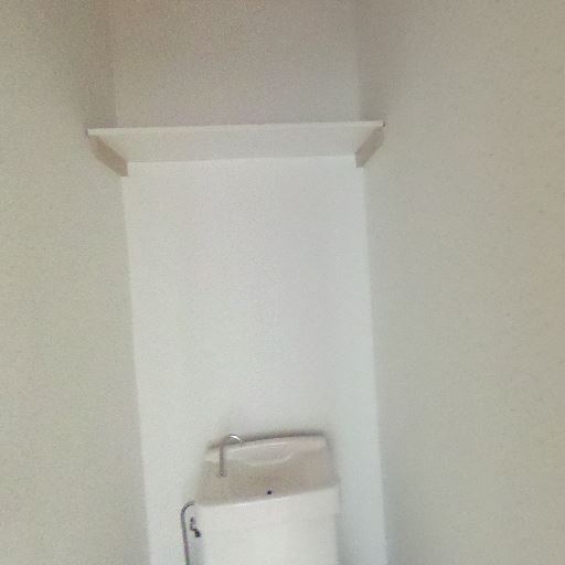 個室トイレであること(確度90%):便器とタンク、トイレットペーパーホルダー、上部棚がある狭小スペース。ドアで廊下と仕切られている。