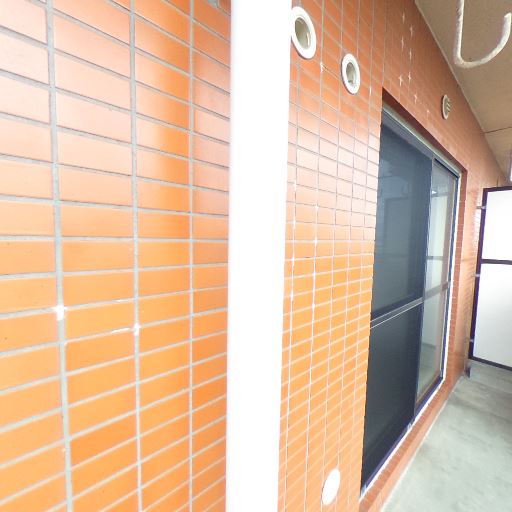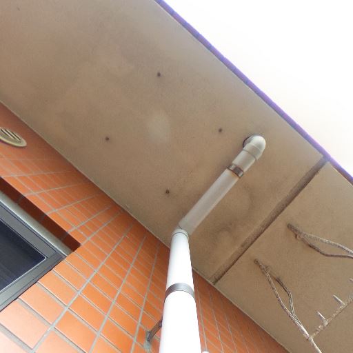外壁タイルとサッシの状態(確度70%):外壁のタイルは概ね良好に見えるが、天井スラブに汚れや黒ずみが点在している。サッシは網入りガラスで目立つ破損は見られない。
