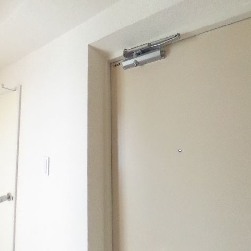 ドアと金物の状態(確度76%):玄関ドアにはドアクローザーと覗き穴があり、表面・金物ともに大きな傷や錆は見えない。