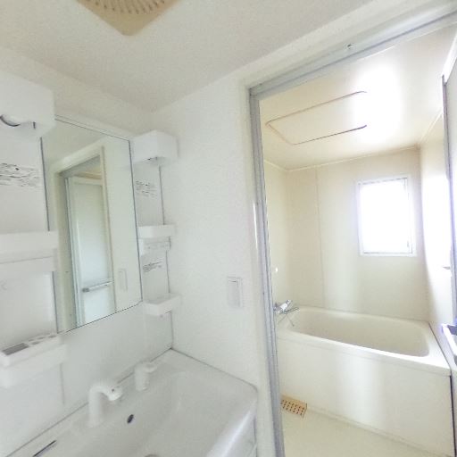 独立洗面台と浴室の配置(確度86%):洗面台の横に浴室があり、脱衣→入浴の動線が短い。鏡付きの洗面化粧台で収納棚もある。