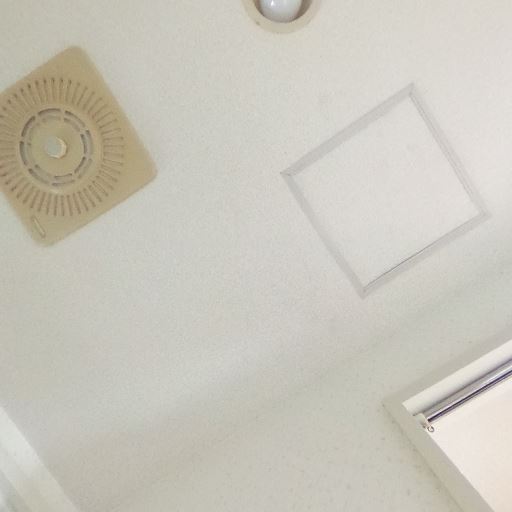 天井設備の状態(確度71%):天井に点検口と換気扇、照明がある。換気扇カバーがやや黄変して見える。