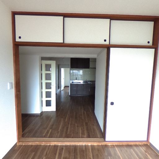 続き間のレイアウト(確度86%):手前の洋室と奥のLDKが引き戸で仕切られた続き間。上部に天袋収納がある。