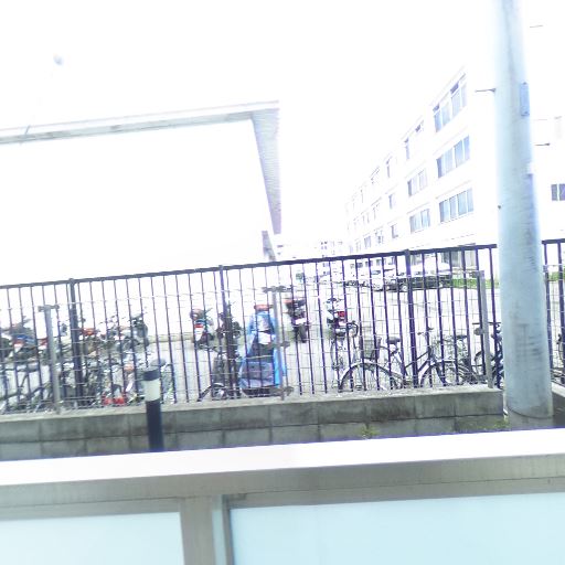 視界と周辺環境(確度74%):前面は駐輪場と建物が見え、抜けはあるが人の往来や視線がありそう。