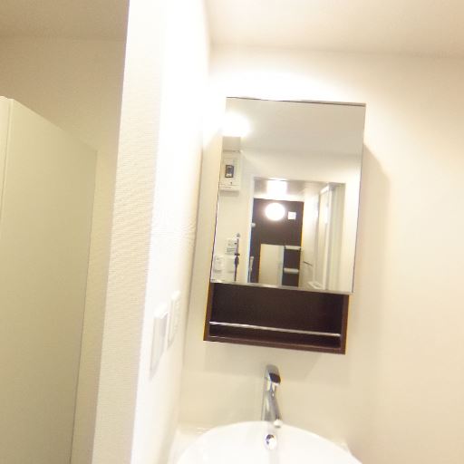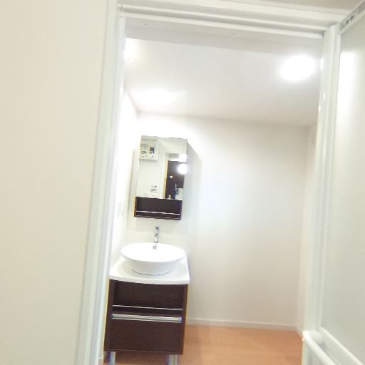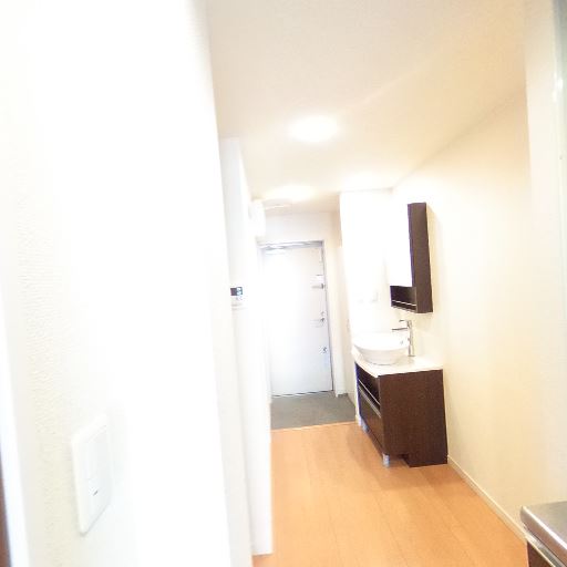 独立洗面台あり(確度72%):廊下側にボウル型の独立洗面台とミラー収納が見える。