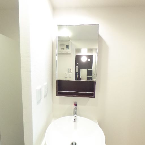 独立洗面台(確度86%):丸型ボウルと鏡収納付きの独立洗面台がある。洗面下には引き出し収納も見える。