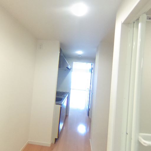 廊下とキッチンのレイアウト(確度74%):玄関から細長い廊下に沿ってキッチンが配置され、奥に採光のある居室が続く。