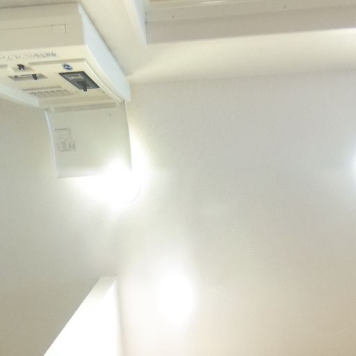 天井設備(確度69%):天井にダウンライトが複数あり、分電盤も見える。照明は十分に確保されている。