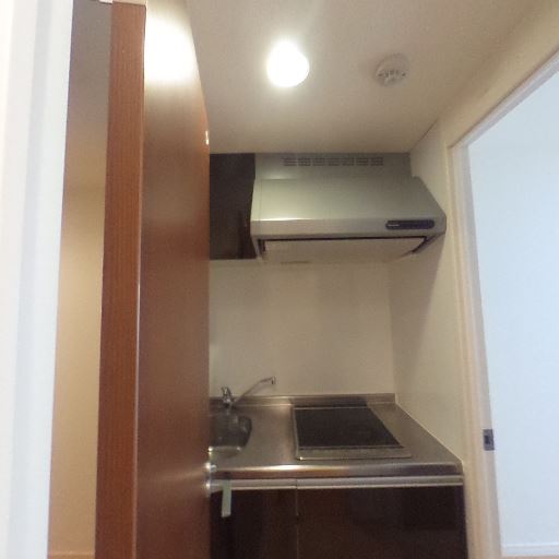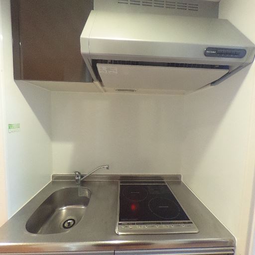 ミニキッチン(IHコンロ2口・レンジフード)(確度88%):単身向けサイズのステンレス天板キッチン。シンクは小さめだがIH2口とレンジフードが設置されている。