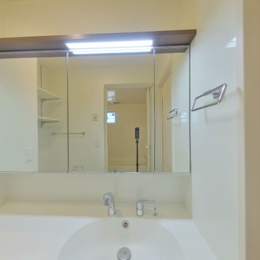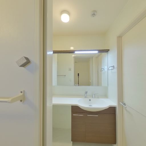 • 独立洗面台が広めで使いやすそう(確度92%):洗面ボウルの前に三面鏡付きの独立洗面台があり、カウンター面も比較的すっきりしている。日常の身支度や小物置きに使いやすい構成に見える。