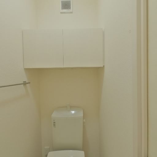 • 上部収納付きのトイレ(確度95%):便器上部に吊戸棚が設置されており、トイレットペーパーや掃除用品を収納できる構成に見える。
