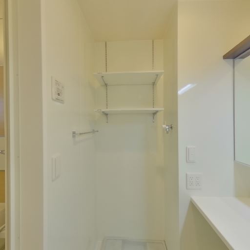 • 洗濯機置き場上の可動棚が便利(確度95%):洗濯機置き場と思われるスペースの上部に棚が2段あり、洗剤やタオル類の収納に活用できそう。空間を有効利用しやすい。
