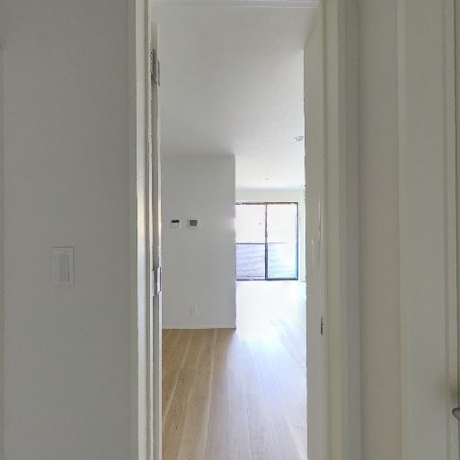 室内への抜けと採光(確度76%):玄関から先の廊下越しにリビングの大きな窓からの光が差し込んでいる。玄関自体は窓がないが、奥からの自然光で明るさが確保されている。