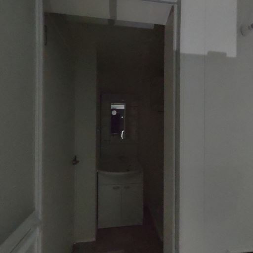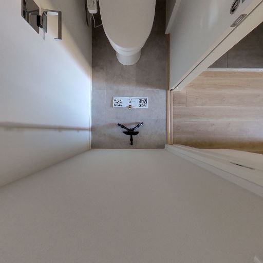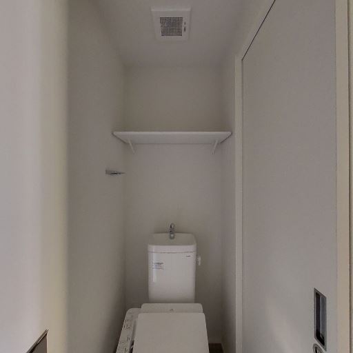 独立トイレの存在(確度90%):コンパクトな個室トイレがあり、上部に換気扇と棚が設置されている。ドアは引き戸で廊下側へ面している。