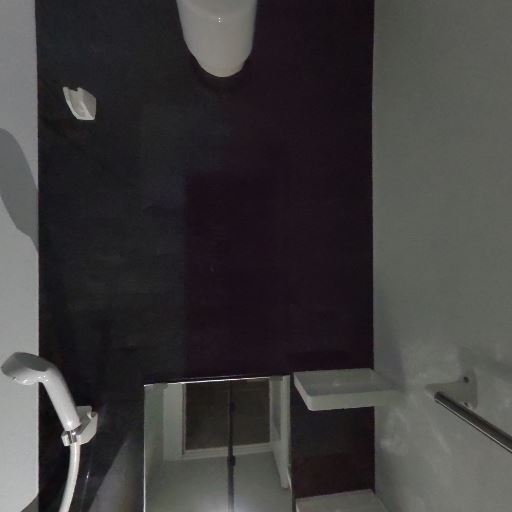ダークパネルのアクセント壁(確度73%):シャワー側の壁がダークカラーで、鏡・棚・手すりが備わったアクセント仕様。