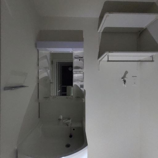 独立洗面台と収納棚あり(確度82%):洗面化粧台と上部に可動棚が見える。日用品の収納がしやすそう。
