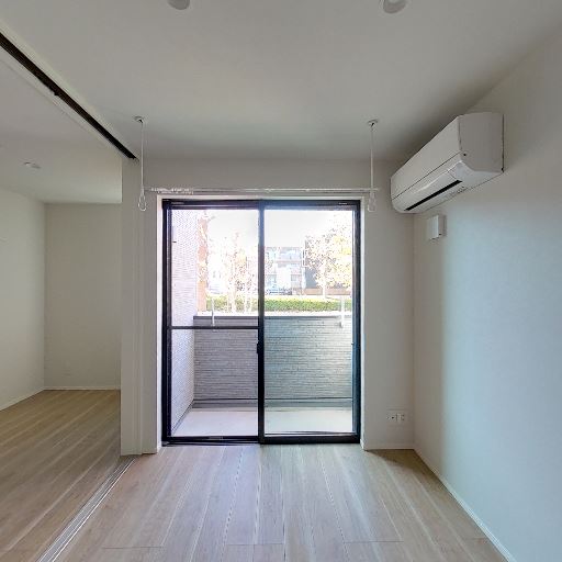 隣室(居室)へ引き戸で接続(確度80%):クローゼット側から居室が見え、引き戸で仕切られている。居室には大きな掃き出し窓とエアコンがある。
