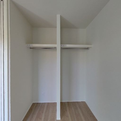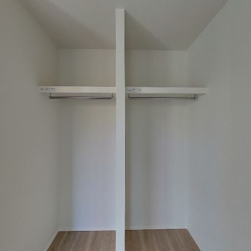 ウォークインクローゼットのような収納(確度86%):左右にハンガーパイプと棚があり、中央に仕切りがある収納スペース。床はフローリングで新しめに見える。