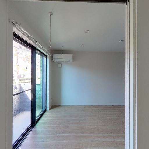 採光と眺望(確度80%):掃き出し窓とバルコニーがあり、外の緑が見える。室内は日中の自然光が届いている。